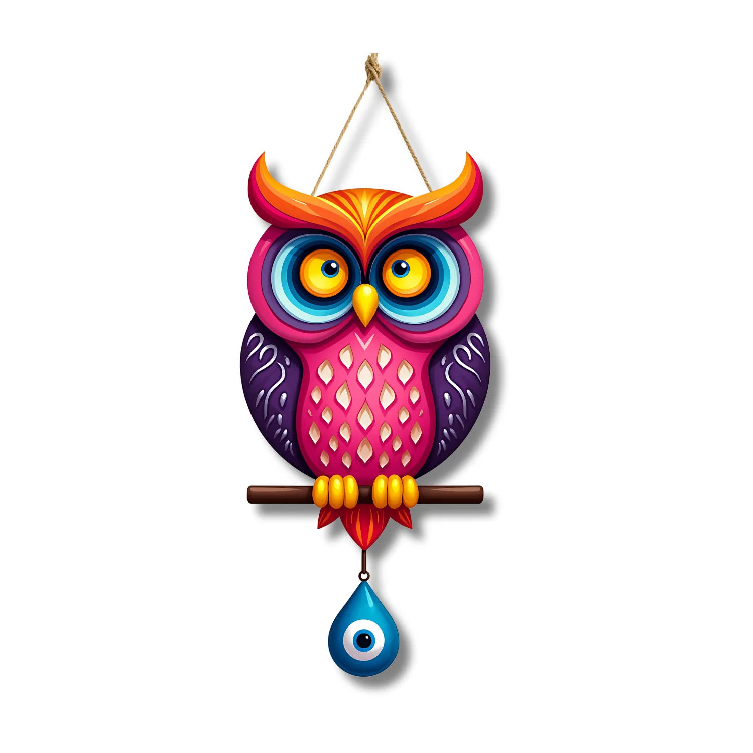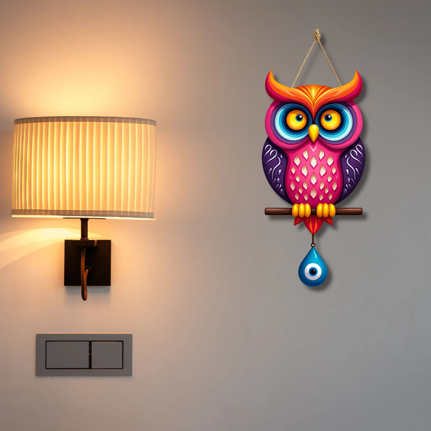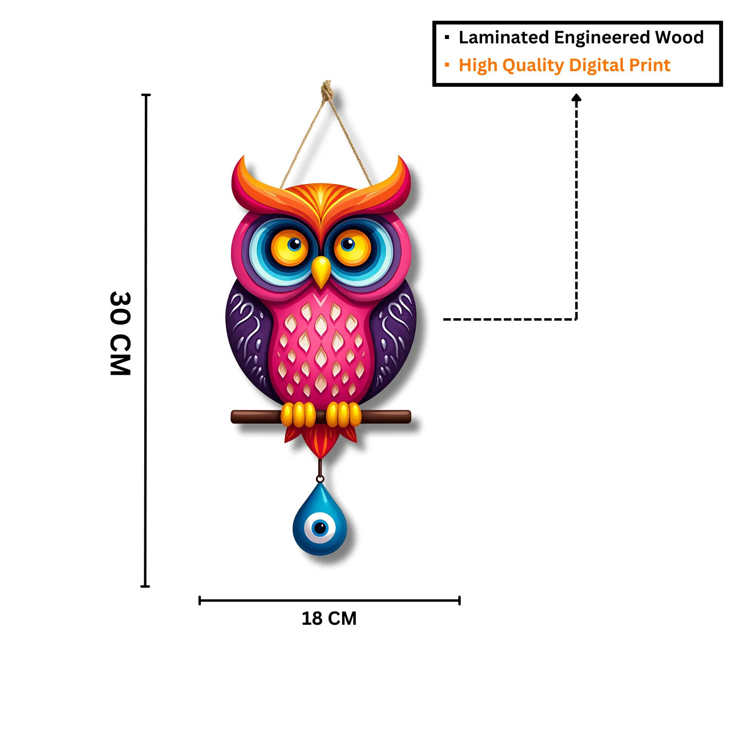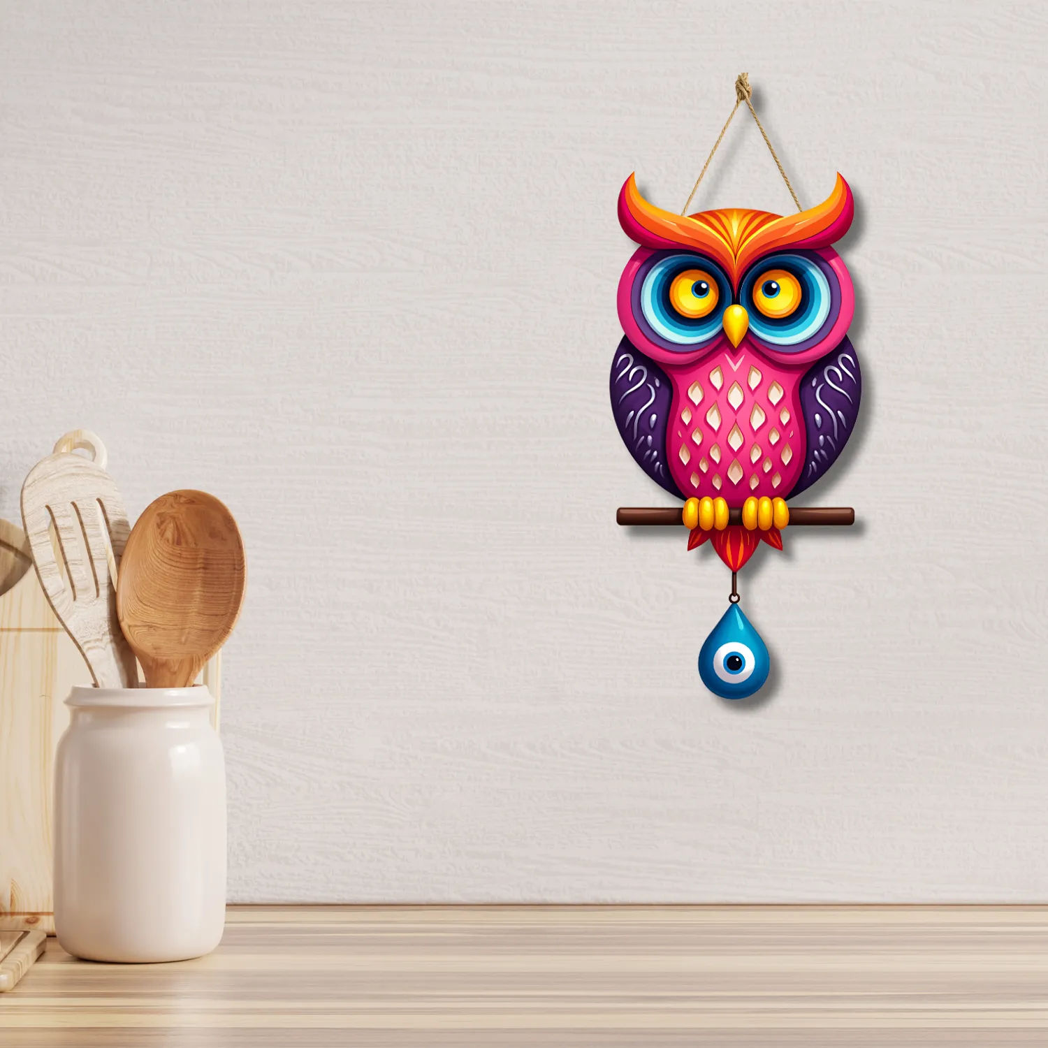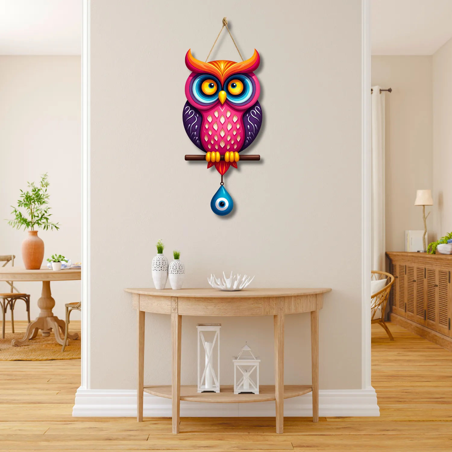 Add a unique charm and protective energy to your home with this beautifully crafted Owl Shape Wooden Wall Hanging. Designed with a symbolic evil eye motif and crafted from premium MDF wood, this decorative piece is a stunning blend of modern art and cultural tradition. Perfect for your living room, dining room, or doorway, it makes a stylish statement while warding off negativity.