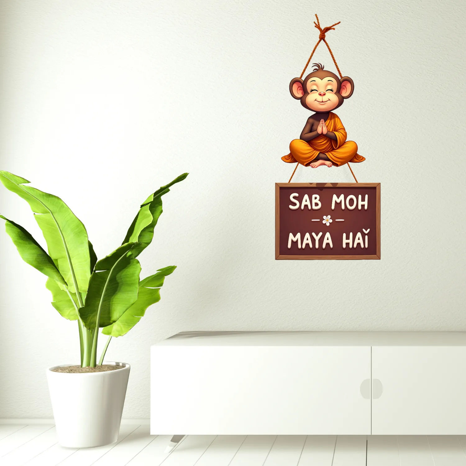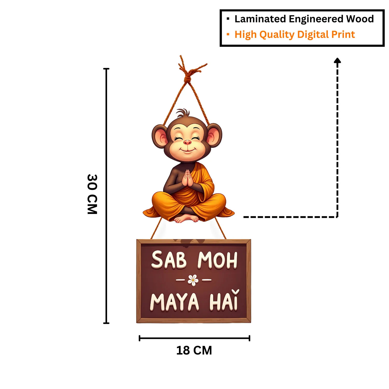 Infuse your home with humor, charm, and a touch of deep philosophy with this quirky 'Sab Moh Maya Hai' Wooden Wall Hanging. Featuring a cute, calm monkey design, this eye-catching piece is more than just décor—it's a reminder to relax, let go, and not take life too seriously. Perfect for your living room, dining area, kitchen, or any spot that could use a fun and thoughtful touch.